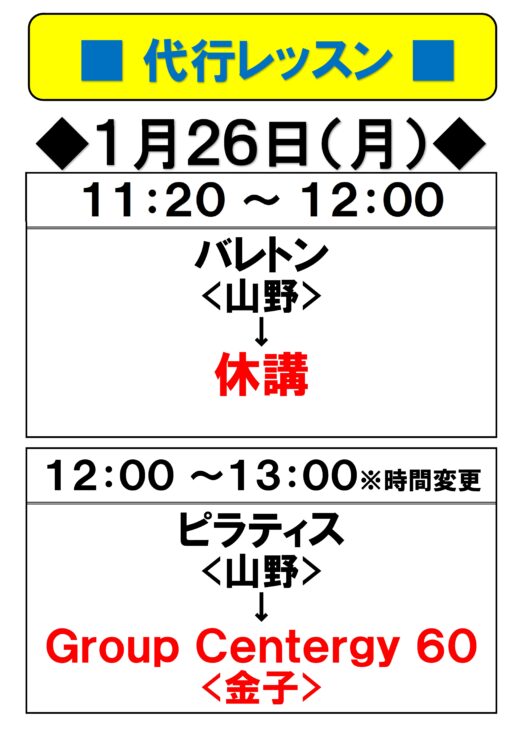 1月13日&27日(火) 代行レッスンのご案内 ※時間変更有