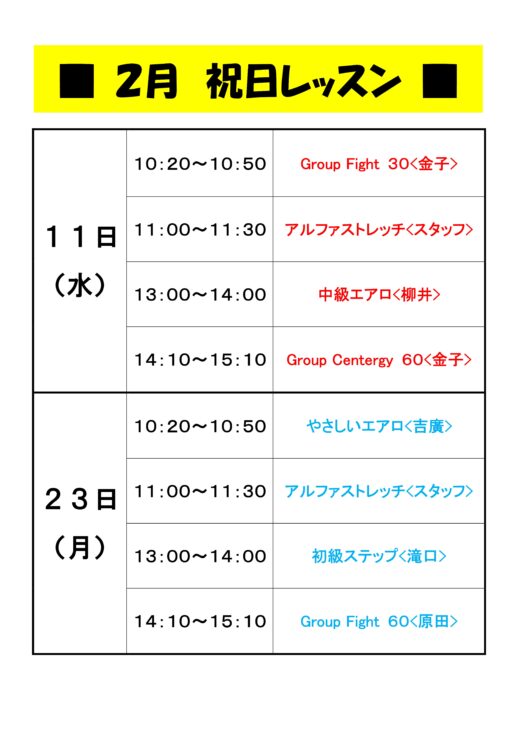 2月11日(水)&23日(月) 祝日レッスンのご案内