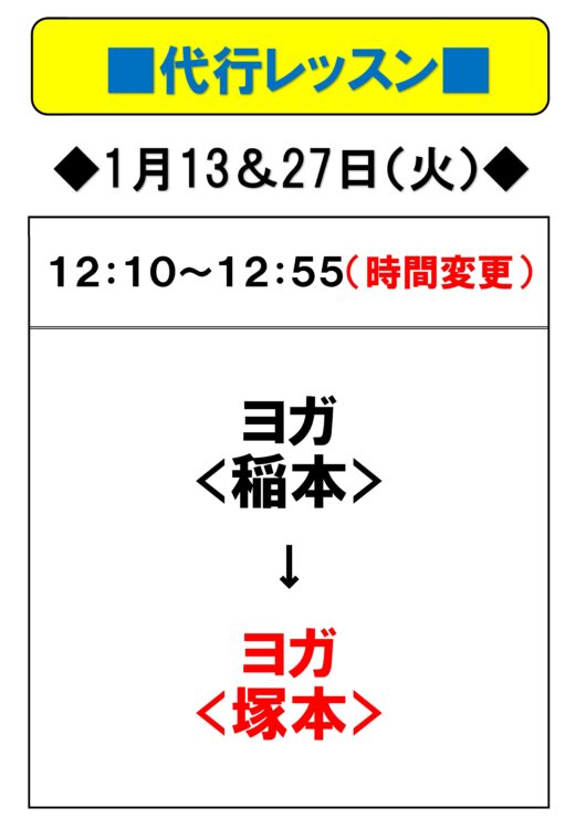 1月13日&27日(火) 代行レッスンのご案内 ※時間変更有
