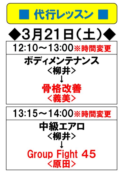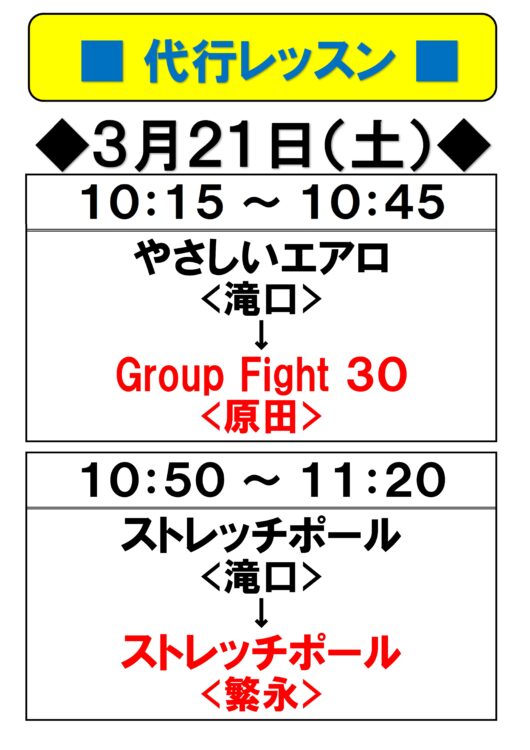 3月21日(土) 代行レッスンのご案内 ※一部時間変更有り